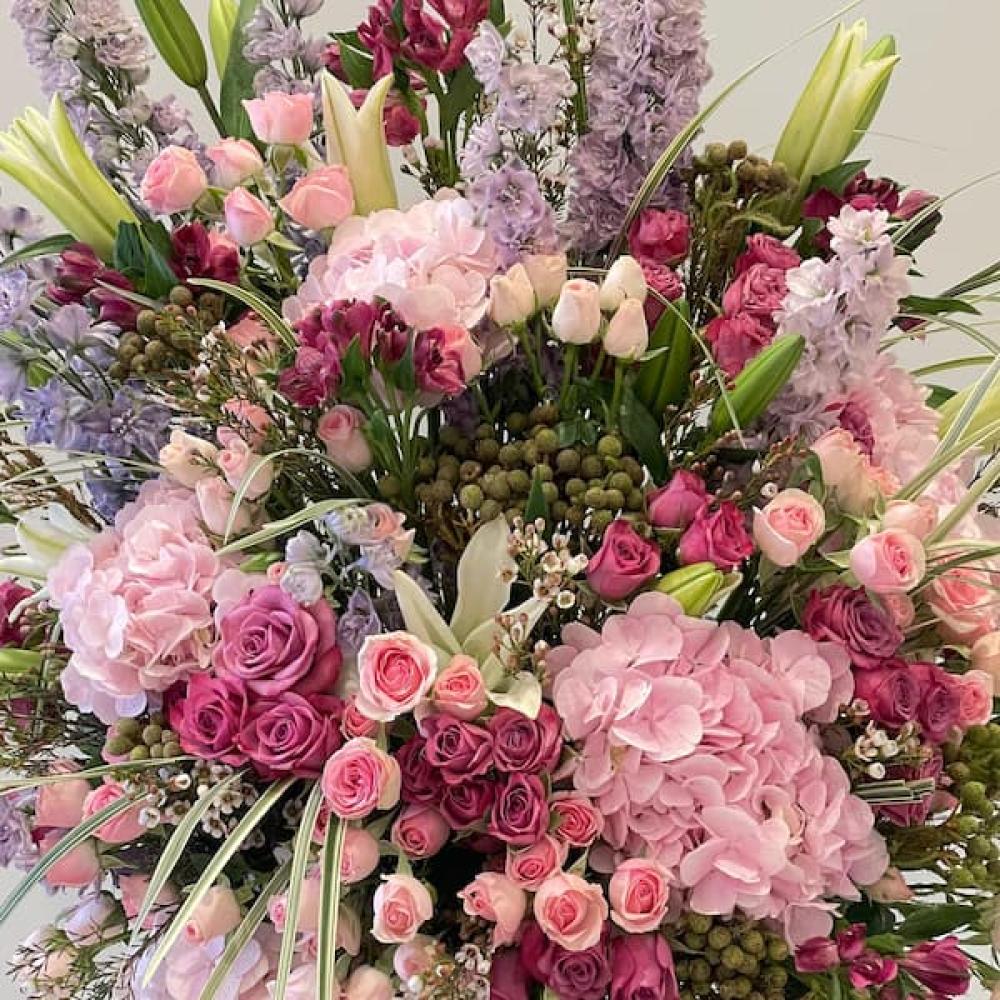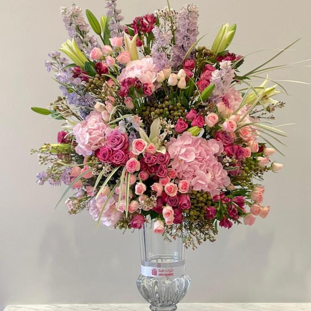 - النوع: باقة كبيرة من زهور طبيعية منسّقة داخل فازة زجاج فاخرة