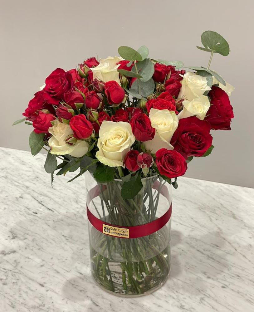 اطلب الآن ورد طبيعي جميل أبيض وأحمر في فازة واستمتع بهدية تنبض بالأناقة والجمال.